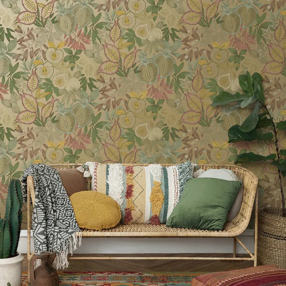 Nagano er et frodigt og levende tapet med et rigt samspil af frugter og bladværk. Granatæbler, figner og æbler indgår i et detaljeret mønster, der giver væggen et varmt og dekorativt udtryk. Farvesætningen tilfører rummet dybde og karakter uden at virke dominerende.
