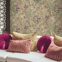 Sazanka er et elegant og afdæmpet tapet med slyngende camelliablomster, der bevæger sig roligt hen over en blød, let tekstureret bund. Det florale motiv har et afbalanceret og harmonisk udtryk, hvor detaljerne træder fint frem uden at dominere. Farvetonen understøtter en rolig og indbydende stemning, der passer smukt ind i både klassiske og moderne rum.
