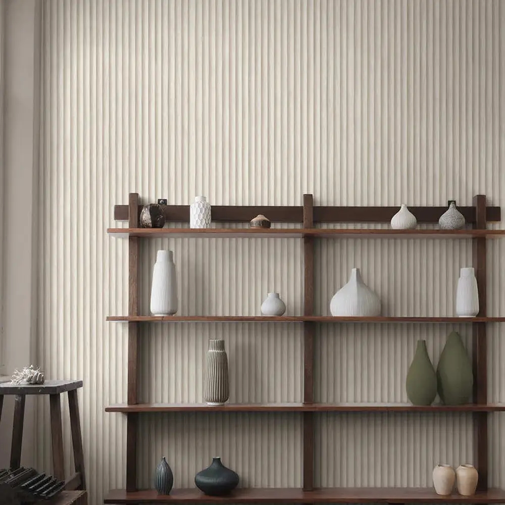 Teak er et raffineret og elegant tapet inspireret af japansk minimalisme og træets naturlige udtryk. Det enkle, skrå mønster skaber en diskret tredimensionel effekt, der giver væggen dybde og et lyst, roligt præg. Overfladen leder tankerne hen på træets struktur og tilfører rummet en let og harmonisk stemning.