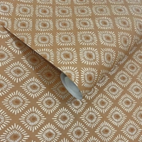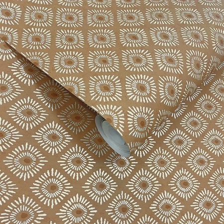 Sunstone er et dekorativt tapet med radiære motiver inspireret af indisk block print og solens betydning som kilde til lys og varme. Det gentagende mønster giver væggen et levende, men stadig afbalanceret udtryk, hvor den varme orange farvetone tilfører rummet energi og dybde uden at virke overvældende.
