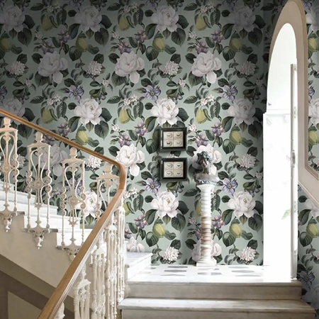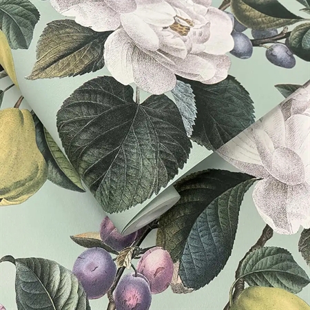 Elegant pæremotiv med blomster fra tapetkollektionen Tales of the Manor af Holden Decor – et harmonisk design med naturens rolige skønhed i centrum.