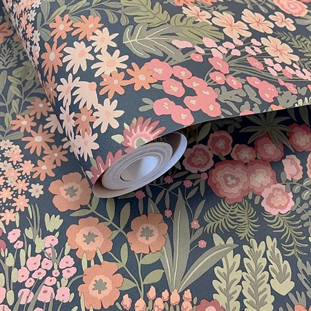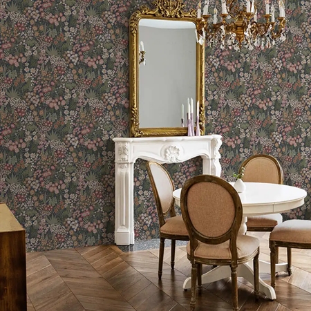 Tæt blomsterdesign i små stiliserede former fra Tales of the Manor-kollektionen af Holden Decor. Et balanceret tapet i afdæmpede farver, der skaber ro og sammenhæng i rummet.