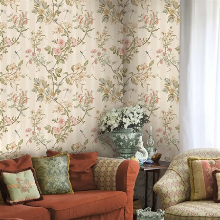 Romantisk blomsterdesign fra Tales of the Manor-kollektionen af Holden Decor – med forårsblomster, elegante striber og fine guldsmede mellem rankerne.