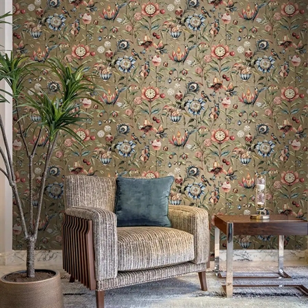 Et farverigt og fantasifuldt tapet fra Tales of the Manor-kollektionen af Holden Decor – med eksotiske dyr og dekorative objekter på en juvelfarvet baggrund.