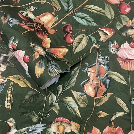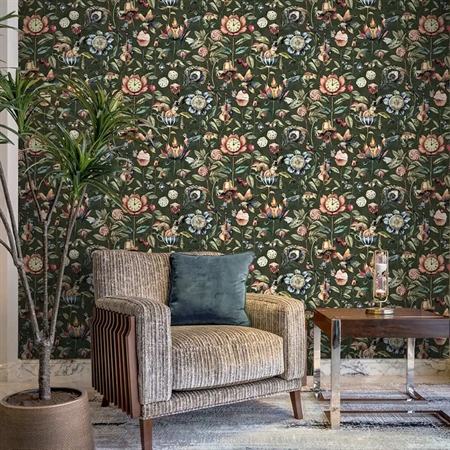 Et farverigt og fantasifuldt tapet fra Tales of the Manor-kollektionen af Holden Decor – med eksotiske dyr og dekorative objekter på en juvelfarvet baggrund.