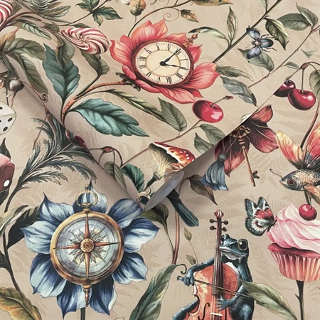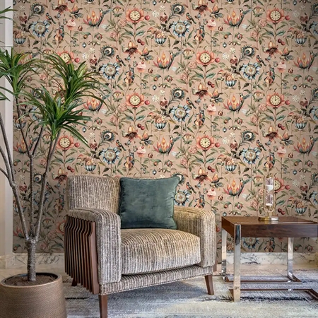 Et farverigt og fantasifuldt tapet fra Tales of the Manor-kollektionen af Holden Decor – med eksotiske dyr og dekorative objekter på en juvelfarvet baggrund.