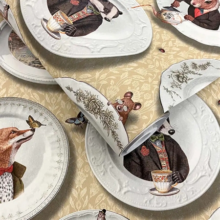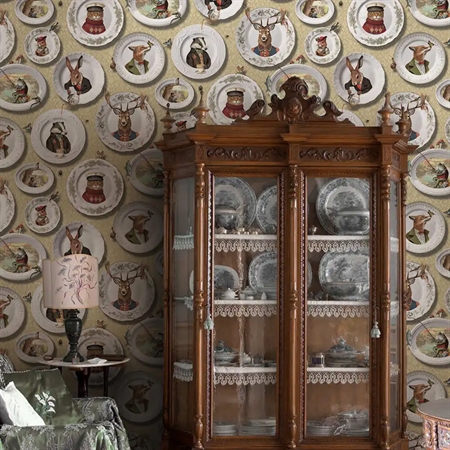 Vintage-inspireret tapet med finurlige dyr i legende scener – en charmerende og fantasifuld detalje fra Tales of the Manor-kollektionen fra Holden Decor.