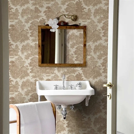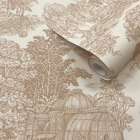 Vintage-inspireret tapet med motiver af private haver, drivhuse og frodigt planteliv – et romantisk tapet fra Tales of the Manor-kollektionen fra Holden Decor.