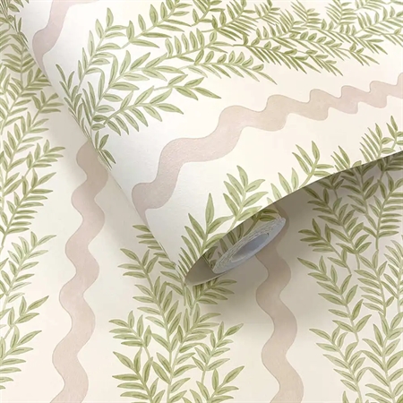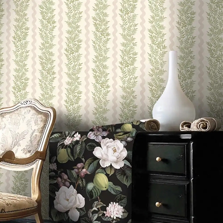 Moderne stribet tapet fra Tales of the Manor-kollektionen fra Holden Decor – med diskrete blade og en elegant, bølgende struktur, der skaber et stilrent og organisk udtryk.