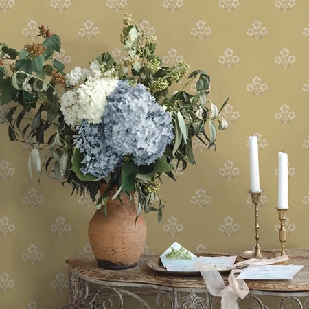 Et klassisk tapet med småblomstrede motiver og afdæmpede farver. Tapetet skaber et roligt og tidløst udtryk – en del af Tales of the Manor-kollektionen fra Holden Decor.