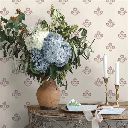Et klassisk tapet med småblomstrede motiver og afdæmpede farver. Tapetet skaber et roligt og tidløst udtryk – en del af Tales of the Manor-kollektionen fra Holden Decor.