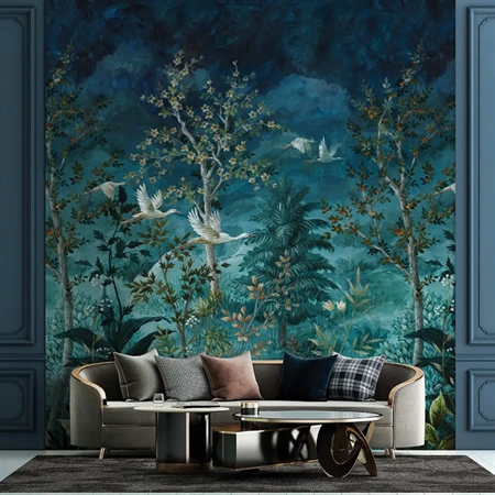 Et stemningsfuldt fototapet med mørke trækroner og fugle i flugt mod en natteblå himmel. Midnight Canopy Blue indfanger stilheden i et måneoplyst landskab og bringer naturens poesi og dybde ind i rummet.