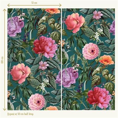 Et frisk og livligt tapet med et tæt blomsterudtryk i blågrønne nuancer. Botanicus Aqua fanger følelsen af en frodig botanisk have og bringer naturens farverigdom og ynde ind i hjemmet – perfekt til rum med lys og liv.