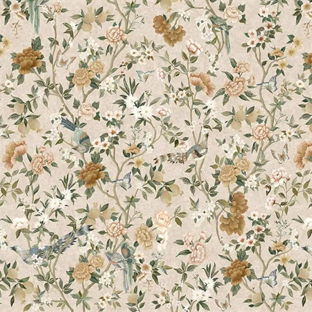 Et roligt og elegant fototapet, inspireret af de klassiske haver ved Den Forbudte By i Beijing. Slyngende pæoner breder sig harmonisk over væggen og flettes sammen med fine fugle og sommerfugle, som giver motivet liv og lethed. De håndmalede detaljer og den afdæmpede farvesætning skaber en stemningsfuld og tidløs bagvæg, hvor naturens skønhed og ornamentik går op i en højere enhed.
