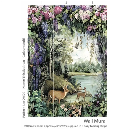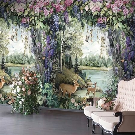 Et stemningsfuldt fototapet fra Tales of the Manor-kollektionen af Holden Decor – med blomstrende skovnatur, rådyr og en fredelig sø i baggrunden. Motivet er malet med fine penselstrøg og leveres i tre store baner, der tilsammen skaber et komplet skovlandskab på væggen.