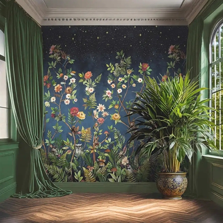 Et finurligt fototapet fra Tales of the Manor-kollektionen af Holden Decor – med et eventyrligt skovlandskab fyldt med blomster, svampe og dyr i hatte og sløjfer. Det detaljerige motiv er sat i en fortryllet skov i tusmørke og skaber en magisk og fantasifuld stemning i rummet.