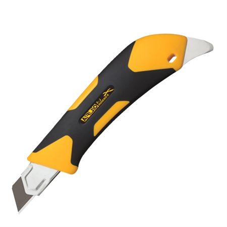 Det ergonomiske håndtag med tæppehage sikrer en behagelig arbejdsoplevelse, selv ved længerevarende projekter, mens skruelåsen garanterer ekstra sikkerhed og stabilitet. De udskiftelige 18 mm refillblade gør det nemt hurtigt at skifte til et nyt blad, så du altid har et skarpt og præcist snit ved hånden.