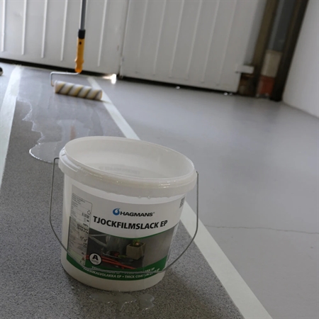 Hagmans Tykfilmslak EP hvorefter du strøger sandet i den våde lak. Lad Tykfilmslak og sand hærde op, og fjern malertapen efter ca. 30 minutter. Når lakken er hærdet op efter ca. 10-15 timer fjernes/slibes overskydende sand væk og støvsuges og hefter tapes malertape ca. 2 mm. fra kanten af hjulsporet, hvorefter der gives endnu et lag Tykfilmslak EP ovenpå sandet. Til slut fjernes malertapen igen.