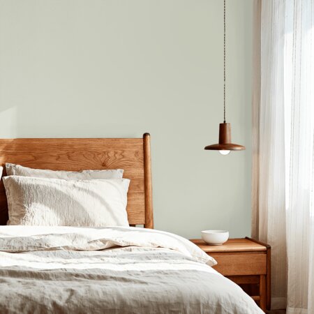 Brug den pastelgrønne Pale Linden som baggrund til en indretning fuld af naturelementer som boliginteriør i træ, grønne planter og blomster.