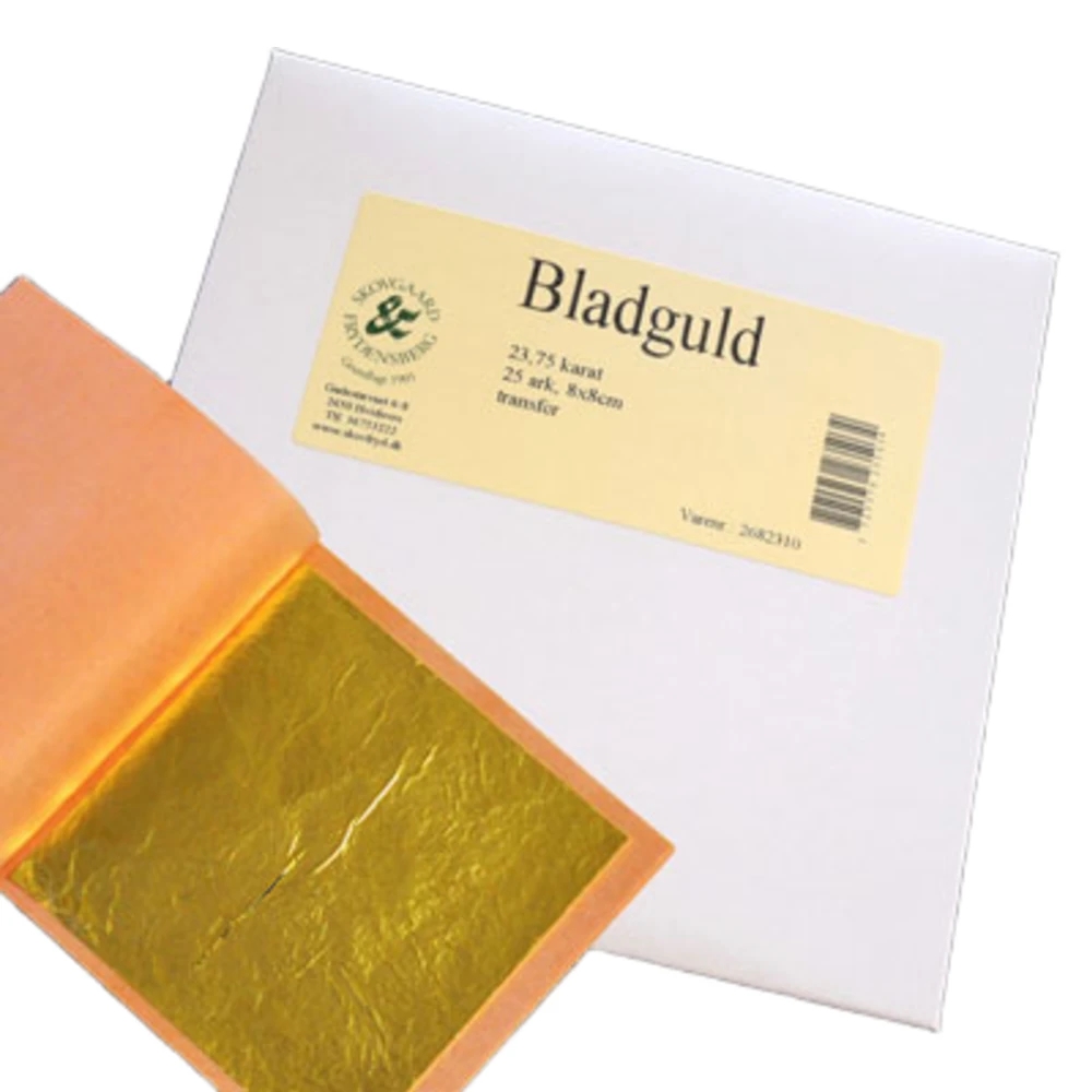 Pakken indeholder 25 ark bladguld, som hver måler 8 x 8 cm – klar til brug i både små og større dekorationsprojekter.