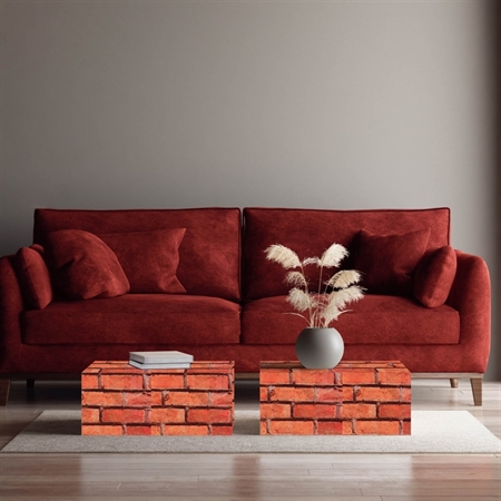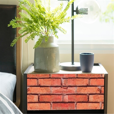 Den selvklæbende folie kan bruges på alt fra møbler og hylder til vinduer og andre overflader og er let at påføre og tage af igen. Folien fås her i modellen Brick, der har et print af en flot, rød murstensvæg.