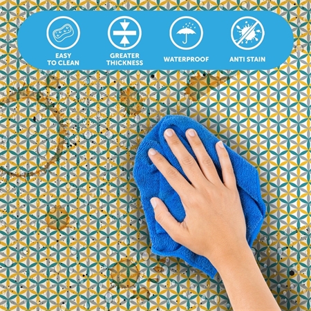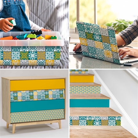 Den selvklæbende folie kan bruges på alt fra møbler og hylder til vinduer og andre overflader og er let at påføre og tage af igen. Folien fås her i modellen Charleston, der har et flot grafisk, mosaik-inspireret mønster i bl.a. grøn og gul.