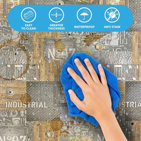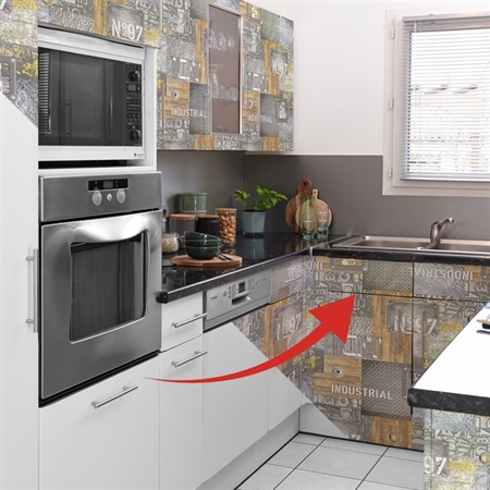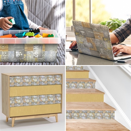 Den selvklæbende folie kan bruges på alt fra møbler og hylder til vinduer og andre overflader og er let at påføre og tage af igen. Folien fås her i modellen Garage, der har et industrielt, collage-inspireret mønster med træ og metal.