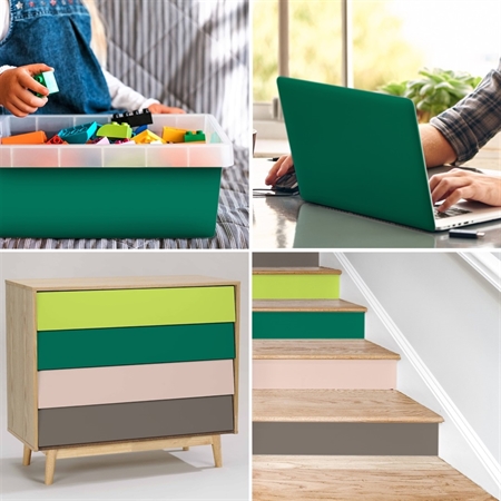 Den selvklæbende folie kan bruges på alt fra møbler og hylder til vinduer og andre overflader og er let at påføre og tage af igen. Folien fås her i farven Green Cedar, der er en dyb, mørkegrøn farve.