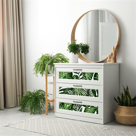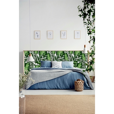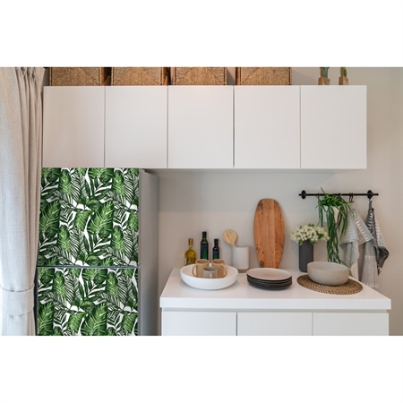 Den selvklæbende folie kan bruges på alt fra møbler og hylder til vinduer og andre overflader og er let at påføre og tage af igen. Folien fås her i modellen House Plants, der er et flot, levende mønster med grønne blade på en hvid baggrund.