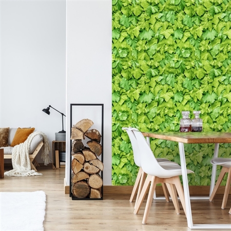 Den selvklæbende folie kan bruges på alt fra møbler og hylder til vinduer og andre overflader og er let at påføre og tage af igen. Folien fås her i modellen Leaves, der har et flot print af friske, grønne blade.