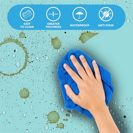 Den selvklæbende folie kan bruges på alt fra møbler og hylder til vinduer og andre overflader og er let at påføre og tage af igen. Folien fås her i farven Opal Blue, en klar, turkisblå farve.