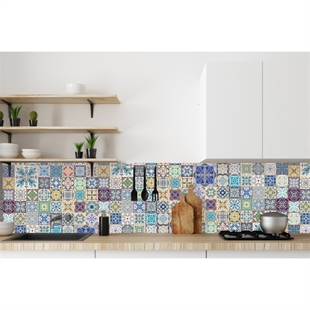 Den selvklæbende folie kan bruges på alt fra møbler og hylder til vinduer og andre overflader og er let at påføre og tage af igen. Folien fås her i modellen Tiles Liana, der har et fint, farverigt print med mosaikfliser i flotte blå og grønne mønstre.