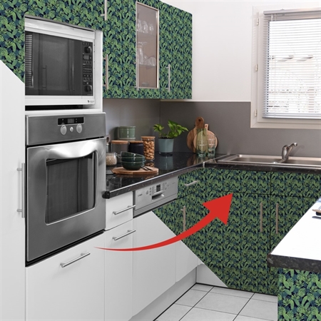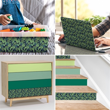 Den selvklæbende folie kan bruges på alt fra møbler og hylder til vinduer og andre overflader og er let at påføre og tage af igen. Folien fås her i modellen Wildnis, der har et flot design med tropiske planteblade i grønne nuancer.